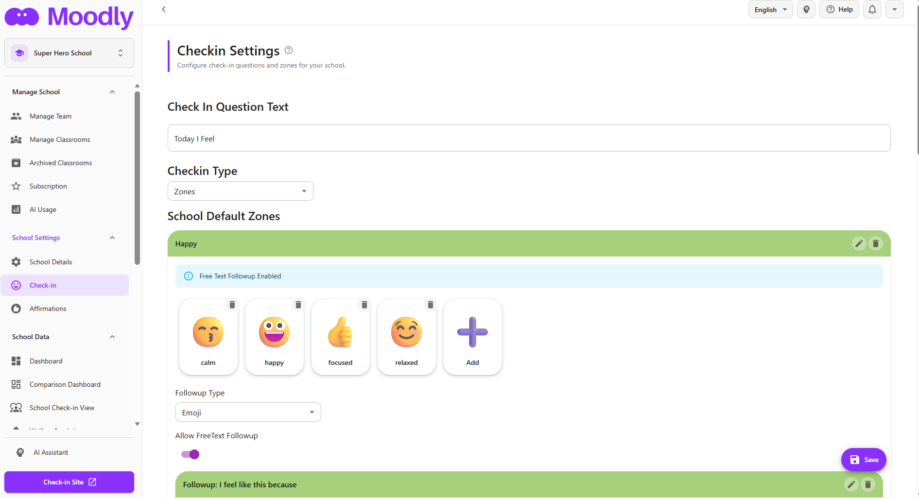 At any time you can revert a class to using the school defaults by turning the Classroom Specific Zones or Classroom Specific Affirmations slide off.